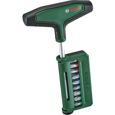 Ergonomic T-shaped with soft grip for full control and high power transmission Extra-long 100mm shaft for fastening tasks in hard-to-reach areas Strong magnetic bit holder for convenient fastening and removal of all kinds of screws Robust, high-quality tool with carbon steel shaft for high torque up to 47 Nm Scope of delivery: T-Handle Bit Screwdriver Set 19-Piece, Weight: 0.2535316013 Pounds, Manufacturer: Bosch