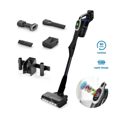 It's easy to clean up visible dirt, but what about the dirt you can't see? The Bosch vacuum cleaner's MicroClean technology picks up even microscopic dirt that would usually get missed. Plus, the sensor-controlled MicroClean ring lights up blue to let you know when your surfaces are truly clean. Can your dustpan and brush do that? And the dust compression slider crams more dirt into the double dust box. That means fewer trips to the wheelie bin to empty it.Good to know- The MicroClean brush picks up over 99.99% of dirt and dust for visibly cleaner floors- Choose from 6 specialised cleaning modes including Delicate Carpets, Car and Silent- Its HEPA filtration system removes pesky allergens from the air to help you breathe easier- Switch modes or check the battery level on the full-colour TFT display- There's an attachment for every job including a furniture brush and crevice tools- You get up to 80 minutes of powerful suction on a single charge - blitz the house in one go