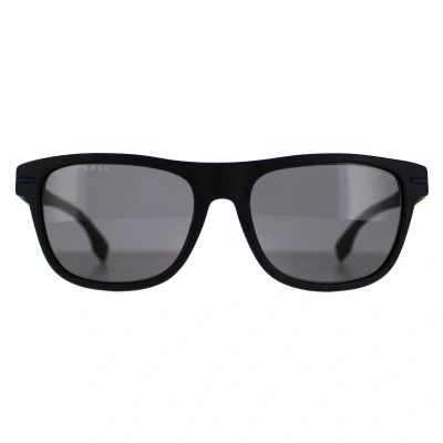 Hugo Boss Rectangle Mens Matte Black Blue Grey Polarized BOSS 1322/S Sunglasses are a stylish square style crafted from premium acetate, these frames promise durability and a comfortable fit, merging reliability with contemporary style effortlessly. Showcasing subtle yet defining details, such as the discreet brand logo adorning the temples, these sunglasses epitomize Hugo Boss's signature design ethos, reflecting superior craftsmanship and a commitment to modern aesthetics. Providing UV protection while making a distinctive fashion statement, these sunglasses elevate any outfit, adding a touch of refinement and confidence.