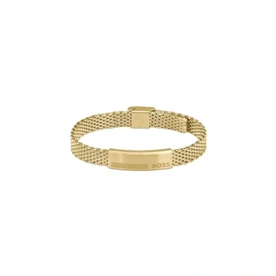 Alen Bracelet: BOSS Jewelry reimagines the mesh watch bracelet with the Alen collection, a modern bracelet pairing a mesh strap with a branded metal plate. Plated Elegance: Infused with a layer of lustrous yellow gold ion plating, this stainless steel jewelry brings understated sophistication to your collection. Adjustable and Stylish Size: Wear the Alen bracelet with comfort thanks to its adjustability, providing a maximum inner circumference of 200 mm. With a width of 10 mm, this piece adds a touch of contemporary style to your wrist. Signature Plate Design: The Alen bracelet features a brushed plate with faceted edges, imprinted with the BOSS logo and a distinctive stripe. This elegant detail adds a touch of sophistication to your wrist, making it a signature piece for your collection. Mesh Clasp Design: This bracelet features a stylish mesh clasp, inspired by watches. The adjustable closure ensures a customized and secure fit.