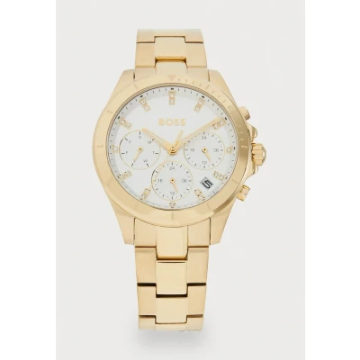 MULTIFUNCTION MOVEMENT.The Alley watch by BOSS features a multifunction movement with day, date, and 24-hour subdials, blending sporty utility with feminine elegance. 36MM STAINLESS STEEL CASE.Crafted from stainless steel, the 36mm case is enhanced with a sport-inspired bezel that adds dynamic contrast to the refined silhouette. SILVER WHITE SUNRAY DIAL WITH CRYSTAL MARKERS.The silver white sunray dial sparkles with crystal hour markers, delivering an elegant twist to the modern, sporty silhouette. STAINLESS STEEL BRACELET WITH YELLOW GOLD ION PLATING.A 5-link stainless steel bracelet with yellow gold ion plating offers a radiant, polished finish with seamless wearability. 5 ATM WATER RESISTANCE.Resistant to splashes and rain—suitable for daily wear, but not recommended for swimming or bathing.