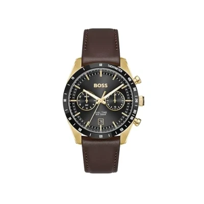 DUAL TIME MOVEMENT WITH DATE – BUILT FOR MODERN TRAVEL.This BOSS men’s watch features a dual time movement with date, allowing you to track two time zones at a glance with precision and ease. 41MM STAINLESS STEEL CASE – SPORT-LUX AND CONFIDENT.The 41mm stainless steel case combines brushed and polished surfaces with a slim tachymeter bezel, delivering a refined yet athletic silhouette. BLACK SUNRAY DIAL WITH MULTI-LEVEL DETAIL – DEEP AND TECHNICAL.The black sunray dial is enhanced with CD-cut and diamond-cut sub-eyes, creating depth and visual interest inspired by classic racing instruments. BROWN LEATHER STRAP – REFINED AND COMFORTABLE.The brown leather strap adds a sophisticated finish to the Tourmaster design, offering comfort and versatility for everyday and business wear. 5 ATM WATER RESISTANCE – READY FOR DAILY USE.Water-resistant to 5 ATM, suitable for rain and splashes. Not suitable for showering, swimming, or submersion.