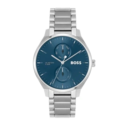 3-hand Quartz Multifunction Movement Case thickness 9.9mm / Case Diameter 43mm Blue sunray dial Stainless steel bracelet Water Resistance: 5ATM It may be worn while showering or swimming, but not scuba diving