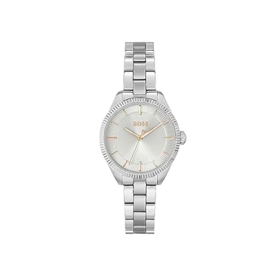 Elegant and timeless, bring a classic to your collection with this watch from Boss. A beautiful gift option, this watch features a round silver dial, with a three-link stainless steel bracelet and rose gold baton time markers and hands. A stunning choice for the everyday, this watch would make the perfect gift for someone special. Stainless Steel Round silver dial 3-link metal bracelet Rose-gold baton markers Rose-gold hands Water resistant to 30 meters Dial Diameter: 32mm