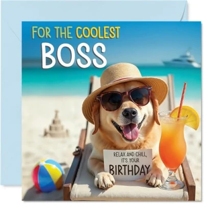Boss Birthday Card Chill Beach Dog Happy for from Employee Colleague, 145mm Bday Greeting Cards