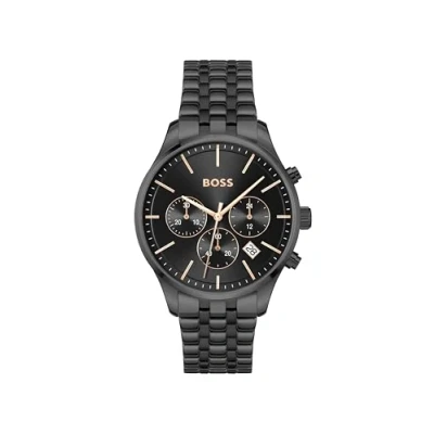 MEN’S CHRONOGRAPH WITH DATE – STYLE MEETS FUNCTION – The BOSS Avery combines precise timekeeping with a date window in a sleek chronograph layout. 42MM BLACK ION-PLATED CASE – MODERN AND MASCULINE – A bold stainless steel case with black ion plating for a sharp, confident look. BLACK SUNRAY DIAL WITH ROSE GOLD DETAILS – ELEGANT CONTRAST – The sunray finish adds depth, accented by refined rose gold-tone hands and markers. BLACK STAINLESS STEEL BRACELET – STRONG AND VERSATILE – A durable bracelet in matching black steel completes the monochrome design. 5 ATM WATER RESISTANT – BUILT FOR EVERYDAY STYLE – A watch for men that handles splashes and stands out every day.