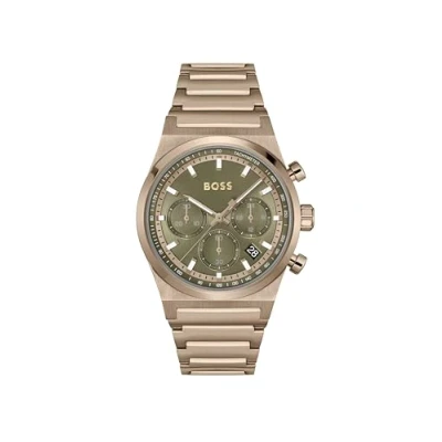 Precision chronograph movement with date - The BOSS Candor Chrono watch features a reliable chronograph movement with a date function, combining precision timekeeping with everyday practicality Refined case dimensions and shape - A 41mm round case with a sleek 10.35mm profile delivers a contemporary and versatile look, embodying the signature elegance of BOSS craftsmanship Olive green brushed dial - Rich and refined - The circular brushed olive green dial features lumi-painted indexes and polished details for a bold, modern finish Beige gold stainless steel bracelet - Elegant and durable - This model is fitted with a stainless steel bracelet in beige gold for a distinctive, premium look Water resistance: 5atm - can be worn while showering or swimming but is not suitable for scuba diving