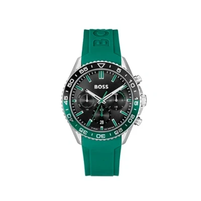 CHRONOGRAPH MOVEMENT WITH DATE – SPORTY AND PRECISE – The BOSS Runner watch features a multi-eye chronograph with date, combining functional timing with a bold sport-lux attitude. 43MM STAINLESS STEEL CASE – BALANCED AND POWERFUL – Brushed and polished finishes highlight the athletic profile of the Runner’s stainless steel case. BLACK BRUSHED DIAL WITH CD-CUT SUB-EYES – TECHNICAL AND DEEP – A circular brushed black dial with applied indexes and lumi-filled hands is enhanced by CD-cut texture on the sub-dials for added depth. GREEN SILICONE STRAP – FLEXIBLE AND INTEGRATED – The integrated green silicone strap blends comfort and durability, giving the Runner a sleek, diving-inspired finish. 5 ATM WATER RESISTANT – READY FOR ACTIVE DAYS – Splash- and rain-resistant. Not suitable for showering, swimming, or submersion.