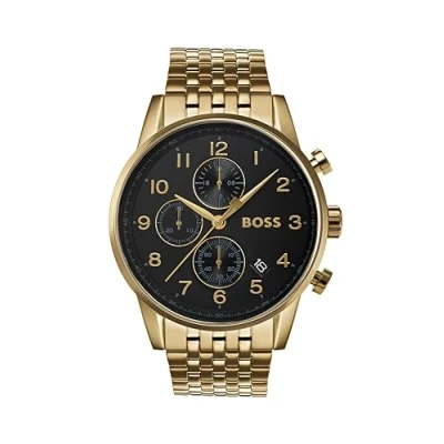 AmazonQuartz Chronograph Movement with Date Function Case Diameter 44mm / Case thickness 10.6mm Black dial Stainless steel bracelet with yellow gold Ion Plating (IP) Water Resistance: 5ATM It may be worn while showering or swimming, but not scuba diving