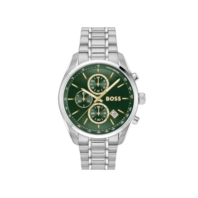 ArgentoAdd sophisticated designer style with this special Boss watch. Crafted with stainless steel, this watch features a deep-green dial with a 3-link metal bracelet, three gold detailed subdials, and a date window. A beautiful option for the everyday, this watch would make a stunning gift. Stainless Steel Date window Deep green face Gold baton time markers 5-link metal bracelet