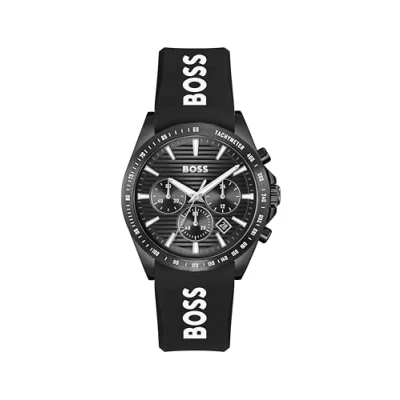 CHRONOGRAPH MOVEMENT WITH DATE – SPORTY AND FUNCTIONAL – The BOSS Strike Chrono features a bold three-subdial layout with date function for precision timekeeping and visual depth. 41MM STAINLESS STEEL CASE – COMPACT AND IMPACTFUL – A brushed and polished case with crown protection and tachymeter scale reflects the Strike Chrono’s modern, performance-inspired design. BLACK SUNRAY DIAL WITH GROOVE TEXTURE – TEXTURED AND DYNAMIC – The dial’s groove-effect sunray finish is accented by horizontal sub-eyes with superfine CD texture and polished, lumi-filled hands. BLACK SILICONE STRAP WITH BOSS LOGO – FLEXIBLE AND STATEMENT-MAKING – The logo-printed strap in soft black silicone integrates seamlessly with the case for a fresh, high-impact summer look. 5 ATM WATER RESISTANT – READY FOR ACTIVE LIFESTYLES – Splash- and rain-resistant. Not suitable for showering, swimming, or submersion.