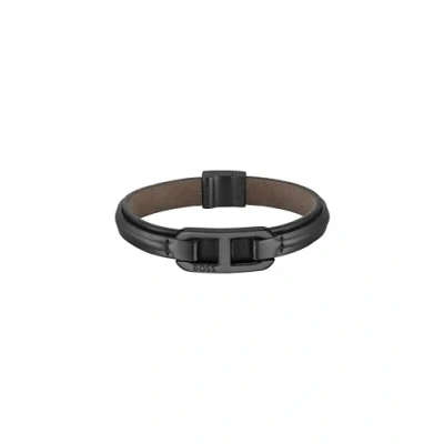 MEN’S BRACELET WITH A STATEMENT CENTERPIECE – A bold BOSS Jewelry design for men who express confidence through minimalist, refined accessories. BLACK LEATHER WITH POLISHED STAINLESS STEEL – The bracelet combines smooth black leather with a polished 316L stainless steel central link for contrast and character. WRIST CIRCUMFERENCE: 190 MM – Designed for a comfortable men’s fit with clean, graphic proportions. ENGRAVED CENTER LINK WITH BOSS LOGO – A sculptural centerpiece styled like a hardware link, etched with the BOSS logo. Matches perfectly with the necklace for a gift-ready set. MAGNETIC CLASP CLOSURE – Easy to fasten and secure, designed for effortless daily wear.