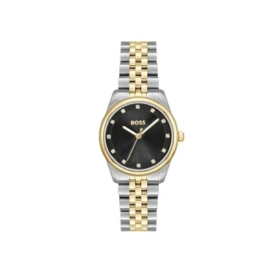 THREE-HAND MOVEMENT.This elegant women's watch by BOSS features a classic three-hand movement, offering timeless functionality for everyday sophistication. 32MM STAINLESS STEEL CASE.The polished 32mm round case is crafted from stainless steel, designed to capture the graceful curves of the Graceful collection. BLACK SUNRAY DIAL WITH CRYSTALS.The black sunray dial is elevated with refined crystal markers in square settings, combining classic femininity with contemporary allure. TWO-TONE STAINLESS STEEL BRACELET.A two-tone bracelet in stainless steel and yellow gold ion plating adds a luxurious touch to this versatile timepiece. 3 ATM WATER RESISTANCE.Water-resistant to 3 ATM, this BOSS watch is splash-proof and ideal for daily wear—just not suitable for swimming or submersion.