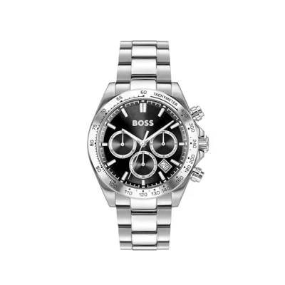 CHRONOGRAPH MOVEMENT WITH DATE – BUILT FOR SPEED AND PRECISION.The BOSS Hero 2.0 watch features a chronograph layout with three sub-eyes and a date window, inspired by dashboard instruments for a racing-style display. 43MM STAINLESS STEEL CASE – STRUCTURED AND SPORTY.Brushed and polished stainless steel defines the bold 43mm case and tachymeter bezel, reflecting the sporty elegance of the Hero 2.0 collection. BLACK SUNRAY DIAL – BOLD AND MODERN.A black sunray dial with a two-layer construction adds dimension and intensity, complete with polished indexes and luminous hands. STAINLESS STEEL BRACELET – ROBUST AND VERSATILE.The 5-link stainless steel bracelet balances shine, strength, and comfort — perfect for everyday performance. 5 ATM WATER RESISTANT – READY FOR DAILY WEAR.Water resistant to 5 ATM: protected against rain and splashes. Not suitable for showering, swimming, or submersion.