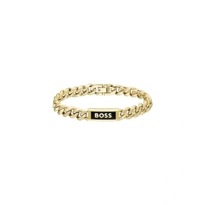 Men's chain bracelet from the BOSS Klassy Emblem Collection: a bold yet refined design that perfectly complements a confident, modern style MADE OF STAINLESS STEEL WITH YELLOW GOLD IP - Crafted from high-quality stainless steel with yellow gold ion plating for a lasting finish and refined shine Elegant design and proportions: Features a sleek 190mm length, a 10mm width, and a bold engraved plate with the iconic BOSS logo and black enamel fill Refined and bold branding: The central plaque highlights the sophistication and power of the BOSS aesthetic, making this bracelet a standout piece Fold-over clasp for secure wear: Equipped with a fold-over closure for easy handling and a secure fit