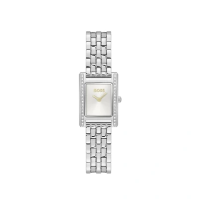 Add quiet luxury to your outfits with this gorgeous watch from Hugo Boss. A classic choice with a twist, this watch features a rectangular dial with white pavé crystals adorning the bezel, a five-link stainless steel bracelet, gold toned hands and has a no time marker design. A gorgeous addition to your collection, this watch adds a stunning style to any look. Stainless Steel Rectangular dial Petite style 5-link metal bracelet White pavé crystal bezel No time marker design Water resistant to 30 meters Dial diameter: 23 mm