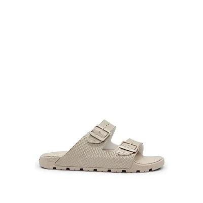Partial inner lining Made from a textured rubberised material mix with two straps and logo buckles in a contemporary design Flat Heel Type Polyvinyl Chloride (PVC) Outer Material