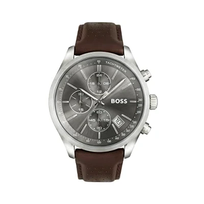 BOSS Men's 43mm Chronograph Quartz Watch Grand Prix Collection with Grey Sunray Dial, Brown Perforated Leather Strap, Date Function, 3ATM Water Resistance 1513476