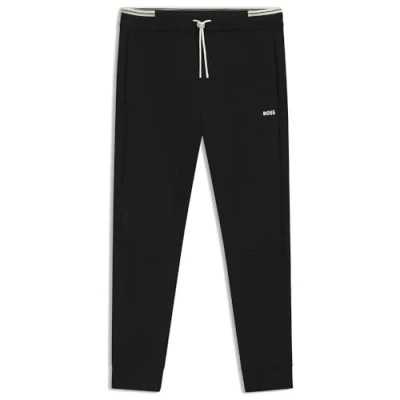 Upgrade your off-duty style with the BOSS Tapered Jogging Bottoms Crafted from a soft cotton-blend with added stretch they feature cuffed hems sporty stripe detailing and a moulded logo for a sleek athletic edge The regular fit ensures all-day comfort making them a versatile essential Perfect for weekend lounging travel days or casual catchups with friends Product Highlights:- Designed with a logo motif on the thigh for a luxury touch - Slip pockets for added practicality Composition: 62% Cotton 5% Elastane 33% Polyester Care: Machine wash
