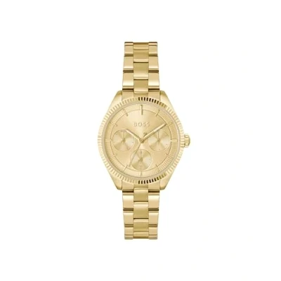 MULTIFUNCTION MOVEMENT – CLASSIC AND ELEVATED – The BOSS Sage Sport features a multifunction layout with day, date, and 24-hour sub-eyes at 3, 6, and 9 o’clock. 34MM STAINLESS STEEL CASE – FEMININE AND STRUCTURED – A sleek case with a fluted bezel and textured reflector ring enhances the luxurious feel of this bestselling collection. GOLD-TONE SUNRAY DIAL WITH FACETED INDEXES – BOLD AND TONAL – A sunray dial in matching gold tone features faceted indexes and polished, lumi-filled hands for an elegant monochrome look. YELLOW GOLD IP STAINLESS STEEL BRACELET – GLEAMING AND STRUCTURED – The stainless steel bracelet is finished in light yellow gold ion plating for a polished, unified finish. 3 ATM WATER RESISTANT – SPLASH-RESISTANT ONLY – Designed to handle light rain and splashes. Not suitable for showering, swimming, or submersion.