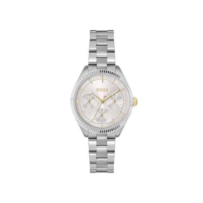 MULTIFUNCTION MOVEMENT – CLASSIC AND ELEVATED – The BOSS Sage Sport features a multifunction layout with day, date, and 24-hour sub-eyes at 3, 6, and 9 o’clock. 34MM STAINLESS STEEL CASE – FEMININE AND STRUCTURED – A sleek case with a fluted bezel and textured reflector ring enhances the luxurious feel of this bestselling collection. SILVER WHITE SUNRAY DIAL WITH FACETED INDEXES – BRIGHT AND REFINED – A radiant sunray finish in silver white pairs with faceted indexes and polished, lumi-filled hands for a crisp, elegant contrast. STAINLESS STEEL BRACELET – TIMELESS AND VERSATILE – The link bracelet in polished stainless steel completes the monochrome elegance of the Sage Sport. 3 ATM WATER RESISTANT – SPLASH-RESISTANT ONLY – Designed to handle light rain and splashes. Not suitable for showering, swimming, or submersion.