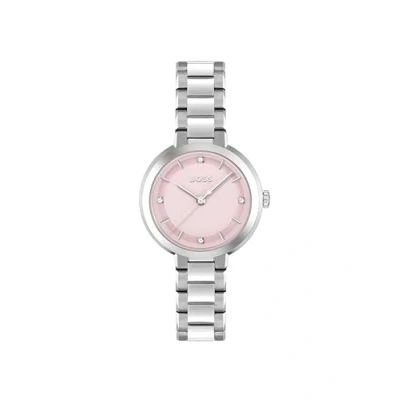 ArgentoAdd pretty sophistication to your looks with this watch from Boss. A beautiful gift option, this watch features a round light pink dial, with a three-link stainless steel bracelet. This watch also has silver baton markers, with white crystals at the 12, 3, 6 and 9 o’clock. A stunning choice for the everyday, this watch would make the perfect gift for someone special. Stainless Steel Round pink dial 3-link metal bracelet Silver baton markers and white crystals Water resistant to 30 meters Dial Diameter: 34mm