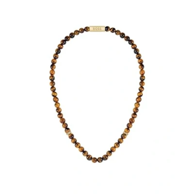Men's Contemporary Beaded Necklace by BOSS: Elevate your style with this sophisticated men's beaded necklace from the BOSS SPHERE collection. Crafted from tiger stone beads, it seamlessly combines modern elegance with everyday versatility. Natural Tiger Stone Beads: Featuring premium natural tiger stone beads, this necklace from the SPHERE collection offers a unique and sophisticated look that enhances any attire with earthy elegance. Perfect Length and Proportions This stainless steel necklace measures 508mm in length with 8mm wide beads, ensuring a balanced and stylish look for any outfit. Distinctive Octagonal Closure: Featuring an octagonal-shaped magnetic closure with an engraved BOSS logo, this piece from the SPHERE collection adds a touch of sophistication and secure style to any modern man's wardrobe. Magnetic Elegance: This necklace features a convenient magnetic closure, offering both style and ease for a sleek and sophisticated accessory