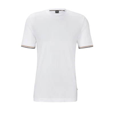 Boss Thompson 04 T-Shirt in White The BOSS Thompson 04 Jersey T-Shirt in White is a classic essential for any man's wardrobe. Made from 100% cotton, it is soft and comfortable to wear. The ribbed crew neck and cuffs provide a flattering fit, while the woven striped design adds a touch of detail. The signature BOSS woven logo pinch tag on the lower left side seam adds a touch of luxury. This versatile t-shirt can be dressed up or down, making it perfect for any occasion. Wear it with jeans and sneakers for a casual look, or dress it up with chinos and a blazer for a more formal occasion.