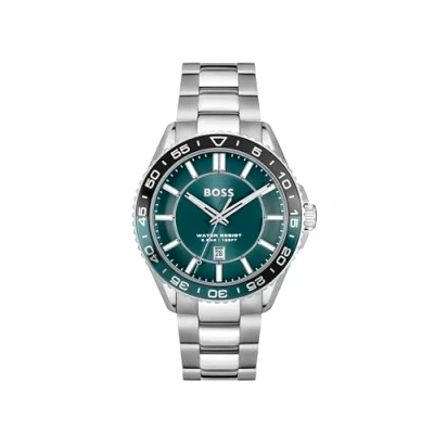 THREE-HAND MOVEMENT WITH DATE – FUNCTIONAL AND FRESH – The BOSS Runner 3H features a clean three-hand layout with date window at 6 o’clock, combining clarity and style. 43MM STAINLESS STEEL CASE – ROBUST AND SPORT-READY – A brushed and polished case offers bold proportions and a durable foundation for an active lifestyle. GREEN SUNRAY DIAL WITH CD-CUT RING – VIBRANT AND MODERN – The dial combines a green sunray finish with a CD-cut outer ring, luminescent hands, and applied indexes for bold contrast. STAINLESS STEEL BRACELET WITH POLISHED CENTER LINKS – STRUCTURED AND EYE-CATCHING – A 3-link bracelet in stainless steel adds contrast and shine with its polished central elements. 5 ATM WATER RESISTANT – BUILT FOR EVERYDAY VERSATILITY – Splash- and rain-resistant. Not suitable for showering, swimming, or submersion.