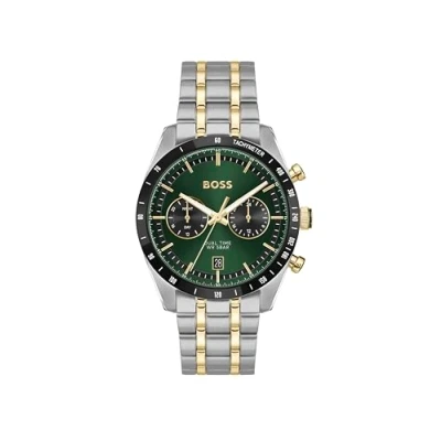 DUAL TIME MOVEMENT WITH DATE – BUILT FOR MODERN TRAVEL.This BOSS men’s watch features a dual time movement with date, allowing you to track two time zones at a glance with precision and ease. 41MM STAINLESS STEEL CASE – SPORT-LUX AND CONFIDENT.The 41mm stainless steel case combines brushed and polished surfaces with a slim tachymeter bezel, delivering a refined yet athletic silhouette. DARK GREEN SUNRAY DIAL – RICH AND SOPHISTICATED.The dark green sunray dial adds depth and character, enhanced by multi-level detailing and contrasting sub-eyes for a refined sport-lux look. TWO-TONE STAINLESS STEEL BRACELET – REFINED AND DISTINCTIVE.The stainless steel bracelet with light yellow gold ion-plated center links creates an elegant two-tone contrast, combining durability with everyday sophistication. 5 ATM WATER RESISTANCE – READY FOR DAILY USE.Water-resistant to 5 ATM, suitable for rain and splashes. Not suitable for showering, swimming, or submersion.