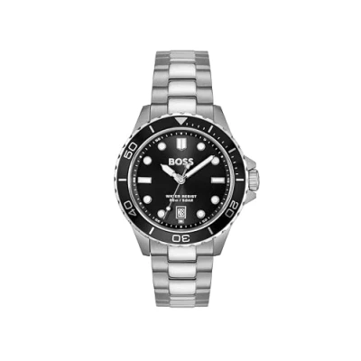THREE-HAND MOVEMENT WITH DATE – RELIABLE AND SPORTY.This BOSS men’s watch from the Troper Sport family features a three-hand movement with date, delivering everyday functionality in a clean, easy-to-read layout. 41MM STAINLESS STEEL CASE – BOLD DIVER-INSPIRED DESIGN.The 41mm stainless steel case is paired with a rotating bezel featuring an aluminum insert, creating a confident diving-inspired silhouette. BLACK SUNRAY DIAL – BOLD AND LEGIBLE.The black sunray dial delivers depth and a confident sport look, finished with applied indexes and luminous hands for clear visibility. STAINLESS STEEL BRACELET – SOLID AND VERSATILE.The stainless steel bracelet adds a clean, structured finish, combining durability with everyday comfort. 5 ATM WATER RESISTANCE – BUILT FOR EVERYDAY ADVENTURE.Water resistant to 5 ATM: suitable for rain and splashes. Not suitable for showering, swimming, or submersion.