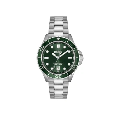 THREE-HAND MOVEMENT WITH DATE – RELIABLE AND SPORTY.This BOSS men’s watch from the Troper Sport family features a three-hand movement with date, delivering everyday functionality in a clean, easy-to-read layout. 41MM STAINLESS STEEL CASE – BOLD DIVER-INSPIRED DESIGN.The 41mm stainless steel case is paired with a rotating bezel featuring an aluminum insert, creating a confident diving-inspired silhouette. GREEN SUNRAY DIAL – BOLD AND LEGIBLE.The green sunray dial delivers depth and a confident sport look, finished with applied indexes and luminous hands for clear visibility. STAINLESS STEEL BRACELET – SOLID AND VERSATILE.The stainless steel bracelet adds a clean, structured finish, combining durability with everyday comfort. 5 ATM WATER RESISTANCE – BUILT FOR EVERYDAY ADVENTURE.Water resistant to 5 ATM: suitable for rain and splashes. Not suitable for showering, swimming, or submersion.
