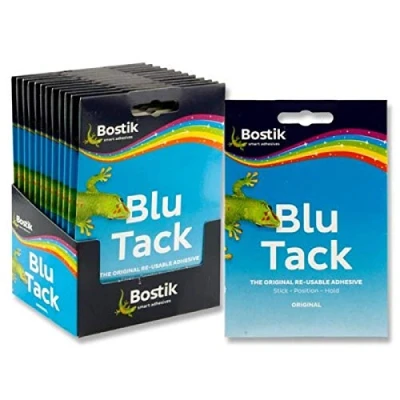 Re-usable adhesive putty. Clean, non-toxic formulation. Stays flexible and won't dry out. Suitable for non-porous surfaces, paint, glass and metal. Easily removable. 0.5g of Blu-Tack can hold up to 105g.