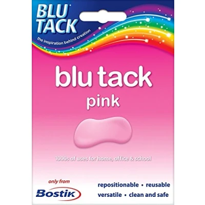 12 Packs of Bostik Blu Tack branded original blu tack adhesive in PINK!!!!(approx. 60g) Reusable glue adhesive; a great alternative to using drawing pins and sticky tape Clean, safe and easy to use Instant stick, no drying time Perfect for sticking pictures, photos, timetables, small posters, menus, notices, decorations and much much more.