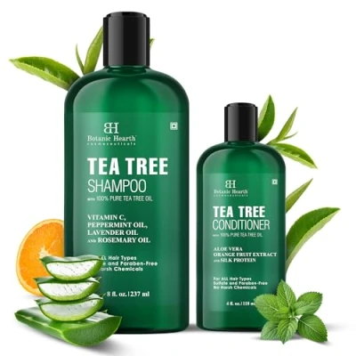 Soothes Itchy & Dry Scalp: Botanic Hearth Tea Tree Shampoo and Conditioner set contains tea tree oil, which provides a calming effect on the scalp and helps with dryness and itchiness while leaving the hair clean and refreshed. Keeps Hair Hydrated & Smooth: This hair care set includes ingredients like chamomile extract, vitamin B5, and vitamin E, which work together to moisturize and hydrate the hair. Supports Scalp Care: The shampoo and conditioner set is formulated to address dandruff and scalp concerns while providing hydration for healthy-looking hair. Enhances Hair Nourishment: Botanic Hearth Tea Tree Shampoo and Conditioner set contains ingredients that help strengthen and nourish hair follicles, supporting overall hair texture.