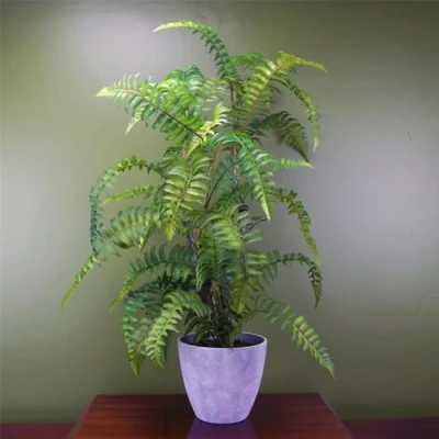 Realistic fern in a decorative plastic planter- ready to display staight out of the box. Multiple fern fronds with realistic colouring Leaf stems are wired and can be shaped to your spacel Overall size 70cm x 60cm x 40cm. The decorative plastic planter is designed to look ceramic and measures 13cm (h) x 15cm (w) The leaves are plastic. The decorative planter is topped with fixed pebbles for an attractive- low maintenance finish Realistic replica of a real plant Botanik product.