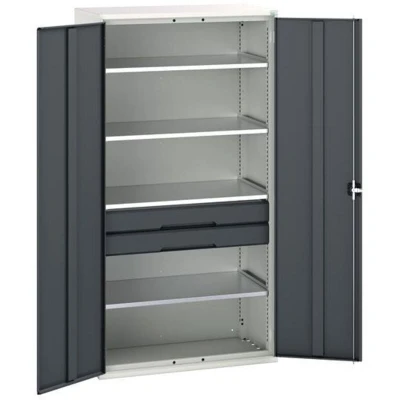 General description This Bott Verso Kitted Cupboard is designed for durability and functionality, featuring a robust, fully welded steel housing finished with a durable powder coat paint. It includes two reinforced doors, four adjustable galvanised steel shelves, and two roller bearing drawers, making it an ideal storage solution for various environments. Technical specifications Colour: RAL 7016 Anthracite Grey Width: 1050mm Depth: 550mm Height: 2000mm Drawers: 2 x 125mm Shelves: 4 Load capacity (shelves): 75kg U.D.L. Load capacity (drawers): 75kg U.D.L.