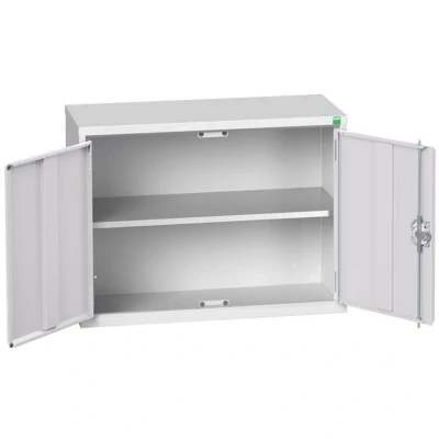 General description This Bott Verso Economy Wall Cupboard is designed to maximize workspace efficiency. It features a height-adjustable galvanised steel shelf with a load capacity of 35kg U.D.L., making it a practical storage solution for various environments. Technical specifications Colour: RAL 7035 Light Grey Width: 800mm Depth: 350mm Height: 600mm Material: Durable steel housing with powder coat paint finish Installation The cupboard can be fixed onto walls to optimize space utilization in the workplace.