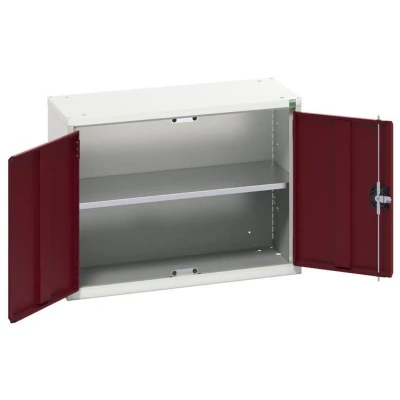 General description This Bott Verso Economy Wall Cupboard is designed to maximize workspace efficiency. It features a height-adjustable galvanised steel shelf with a load capacity of 35kg U.D.L., making it a practical storage solution for various environments. Technical specifications Colour: RAL 3004 Crimson Red Width: 800mm Depth: 350mm Height: 600mm Material: Durable steel housing with powder coat paint finish Installation The cupboard can be fixed onto walls to optimize space utilization in the workplace.