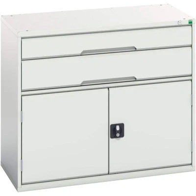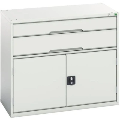 General description This Bott Verso 2 Drawer + Cupboard is designed for durability and functionality, featuring a robust, fully welded steel housing finished with a durable powder coat paint. It is ideal for industrial use, providing ample storage with its drawers and cupboard. Technical specifications Colour: RAL 7035 Light Grey Drawers: 1 x 125mm & 1 x 175mm Shelf: 1 Width: 1050mm Depth: 550mm Height: 900mm Drawers capacity: 75kg U.D.L. Usage Designed to withstand the rigours of industrial use. Drawers fitted with 100% extension roller bearing slides for smooth operation and easy access.