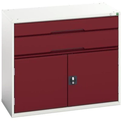 General description This Bott Verso 2 Drawer + Cupboard features a robust, fully welded steel housing finished with a durable powder coat paint, making it ideal for industrial use. Technical specifications Colour: RAL 3004 Crimson Red Drawers: 1 x 125mm & 1 x 175mm Shelf: 1 Width: 1050mm Depth: 550mm Height: 900mm Drawers capacity: 75kg U.D.L. Usage The 2 drawers are designed to withstand the rigours of industrial use and are fitted with 100% extension roller bearing slides for smooth operation and easy access.