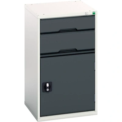 General description This Bott Verso 2 Drawer + Cupboard is designed for durability and functionality, featuring a robust, fully welded steel housing finished with a durable powder coat paint. It is ideal for industrial use, providing ample storage with its two drawers and cupboard. Technical specifications Colour: RAL 7016 Anthracite Grey Drawers: 1 x 125mm & 1 x 175mm Shelf: 1 Width: 525mm Depth: 550mm Height: 900mm Capacity: 75kg U.D.L. for drawers Usage Designed to withstand the rigours of industrial use. Drawers fitted with 100% extension roller bearing slides for smooth operation and easy access.