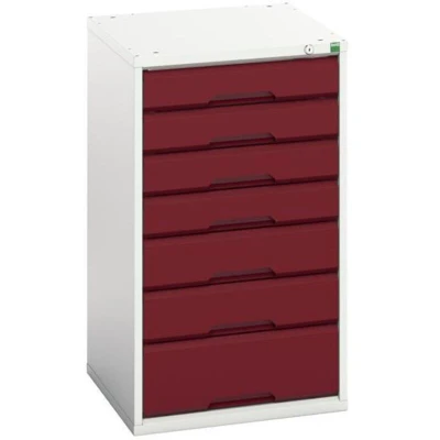 General description This Bott Verso 7 Drawer Cabinet is designed for industrial use, featuring a robust construction with fully welded steel housings. It comes in a striking RAL 3004 Crimson Red finish and offers ample storage with seven drawers of varying heights. Technical specifications Colour: RAL 3004 Crimson Red Width: 525mm Depth: 550mm Height: 900mm Number of drawers: 7 (4 x 100mm, 2 x 125mm, 1 x 175mm) Drawer capacity: 75kg U.D.L Drawer slides: 100% extension roller bearing Other information All drawers are centrally lockable for added security.