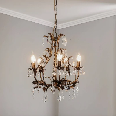 Botte metal chandelier: elegance meets Florentine style The Botte metal chandelier combines Florentine style with impressive 5-bulb lighting that gives any room a special atmosphere. Made from high-quality metal and decorated with sparkling crystals, this chandelier exudes timeless elegance. The bronze colour scheme emphasises the elegant design and makes it an eye-catching feature in any living room or dining room. Another highlight of the Botte chandelier is its dimmability, which is made possible by an external dimmer. This allows the light intensity to be flexibly adjusted to create the desired mood. Made in Europe, this chandelier not only stands for quality, but also for special craftsmanship that can be felt in every detail.