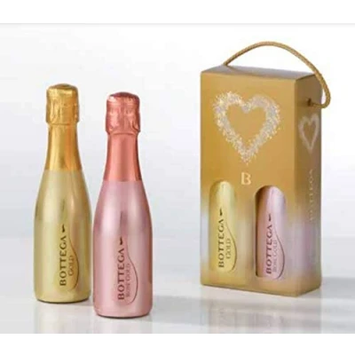 Bottega Gold is a Prosecco DOC, obtained from winemaking in white of Glera grapes grown in the hilly area of province of Treviso. Bottega Gold has been defined as the “Glamor sparkling wine” which is characterized by the bottle from distinctive golden livery. Bottega Rose Gold is a Brut sparkling wine obtained from rosé vinification of Pinot Noir grapes. The package contains: 1 Gold Shop 20 cl 1 Rose Gold Shop 20 cl Bottega Gold Prosecco DOC Spumante Brut Color and Appearance: Brilliant, straw yellow, fine and persistent perlage. Smell: Typical, characteristic and refined with fruity notes (in particular green apple, pear, citrus), floral (white flowers, acacia, wisteria and lily of the valley) and to close with sage and spice. Taste: Soft, harmonious and elegant, with a slender body and acidity present and well harmonized. Rosé Gold Pinot Noir Sparkling Brut Color and Appearance: Brilliant, pale pink colour, fine and persistent perlage. Smell: Intense, complex, elegant, characterized by floral and dominated by fruity notes, among which berries stand out, in particular currants and wild strawberries. Taste: Fresh, delicate, velvety and with excellent structure; marked body and in balance with acidity, it exhibits good retro olfactory persistence.