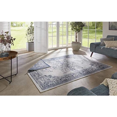One rug - two colour variations. By simply turning the rug which can be used from both sides gets a different colour. The classic oriental design in a slightly used look can be integrated into many different indoor and outdoor furnishings without being obtrusive. A colour-coordinated edging on all four sides of the reversible rug rounds off the overall picture perfectly. Thanks to its robust texture, the BORBON reversible rug from the Twin Supreme collection by Bougari can be used both indoors with underfloor heating and outdoors under moisture and UV radiation - making it a versatile everyday companion. The indoor and outdoor rug is made from 100% polypropylene - synthetic fibres, which are known for their special durability and durability as well as being light in everyday care. Even stubborn dirt can be easily removed with a damp cloth, commercial carpet foam or even a pressure washer. Technical data: material: 100% polypropylene, total height: approx. 5 mm. Total weight: approx. 1350 g/m², available sizes: 80 x 150 cm, 120 x 170 cm, 160 x 230 cm, 200 x 290 cm, diameter 140 cm, diameter 200 cm Box contents: bougari indoor and outdoor rug flat weave reversible rug Borbon (120 x 170 cm, 100% polypropylene, durable and easy to clean, UV and moisture resistant, suitable for underfloor heating), blue cream