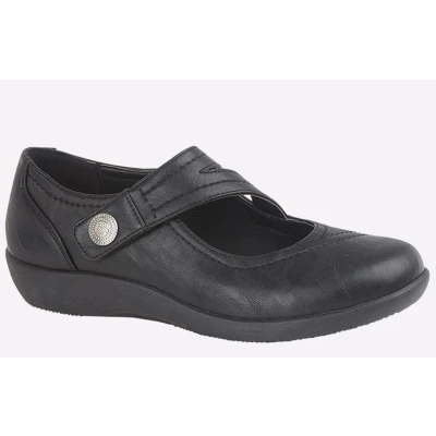 Perfect for work or casual wear, these Boulevard Calgary women's shoes are constructed in a synthetic upper in a black colourway, with intricate stitch detailing and a silver button to complement the hook and loop closure. - Synthetic upper - Wide fit design - Hook and loop closure - Padded footbed - Durable rubber outsole