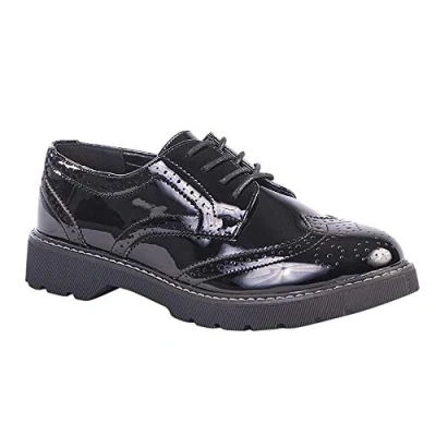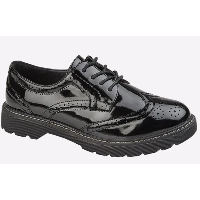 Perfect for work or school, Boulevard deliver these classic Addison black brogues. Designed in a durable synthetic upper in a crisp hi-shine black colourway, and featuring classic punch hole detailing and intricate stitching for increased visual appeal. A durable rubber outsole completes this brogue, making for a sturdy and practical choice. - Synthetic PU upper - Classic brogue styling - Intricate stitch detailing - Secure 4-hole lace fastening - Durable TPR Sole