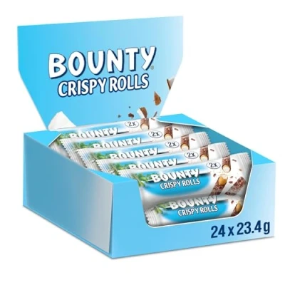 Tempt your tastebuds with crispy wafer, coconut flavoured filling, and smooth chocolate rolled into one delicious treat Hit pause on today’s meeting agenda and have a blissful moment alone with the tropical taste of Bounty Crispy Rolls A coconut-tastic flavoured chocolate treat in your bag makes even those on-the-go school pick-ups and grocery runs feel like paradise Suitable for Vegetarians & no artificial colours, flavours or preservatives 24 x single Bounty Crispy Rolls chocolate biscuit snack bar, 23.4 g x 24 bars