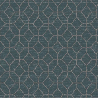 A lightly textured vinyl grass cloth effect wallcoverings with a mid scale geometric trellis with metallic highlights. Shown in the Teal blue colouway.
